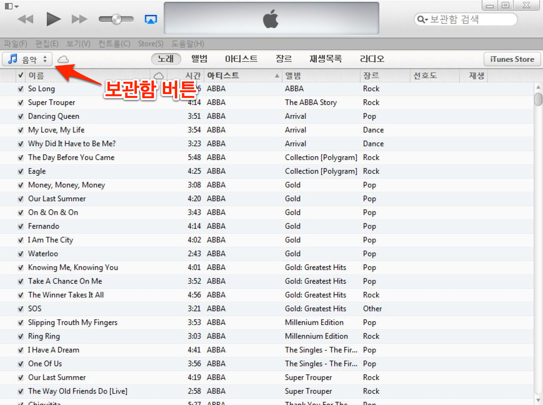 나의 보관함에 없는 항목을 선택하면 쉽게 음악을 가져올 수 있다.