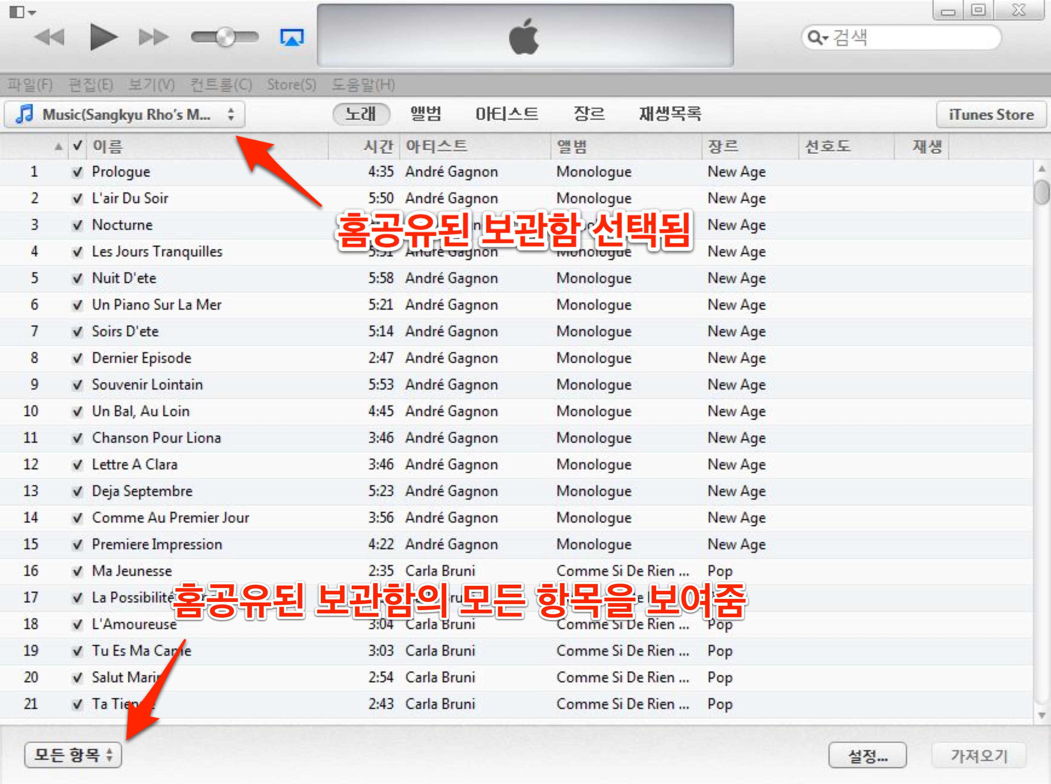 2. iTunes에서 홈 공유된 다른 컴퓨터의 보관함에서 음악 가져오기