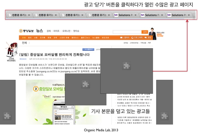 반면, 아래와 같이 대부분의 신문사들은 ‘컨텍스트’의 사용을 오해하거나 제대로 이해하지 못하거나, 혹은 그 가능성을 방치해놓고 있다. 생존을 위해 아예 기사 본문을 뒤덮는 광고까지 게재하기 시작한 것이 어제 오늘 일은 아니다. 그래서 살림살이가 좀 나아졌는가? 간혹 기사 내용이 좋아서 공유를 하고 싶어도 지인들이 페이지를 열고 놀랄까봐 공유버튼 누르기가 꺼려진다. 광고를 살리기 위해 공유 컨텍스트를 희생시킨 경우인데, 그 결과는 어떠한가?