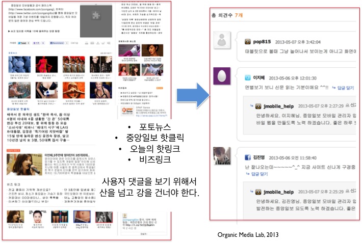 돈버는 컨텍스트도 들여다 보자. 기사 본문을 읽기 위해 광고창의 ‘닫기’ 버튼을 수차례 눌렀지만 광고 페이지만 열고 기사본문을 보는 것은 실패했다. 사람들의 반응이 있는지 확인하려면 기사의 맨 아래까지 내려가야 하는데, 거기까지 건너야 할 산과 강이 너무 많다. 계속 공유되고 연결되어 기사를 오랫동안 살아남는 콘텐츠로 만드는 것보다 광고 클릭수가 더 중요한 비중을 차지하기 때문이다.
