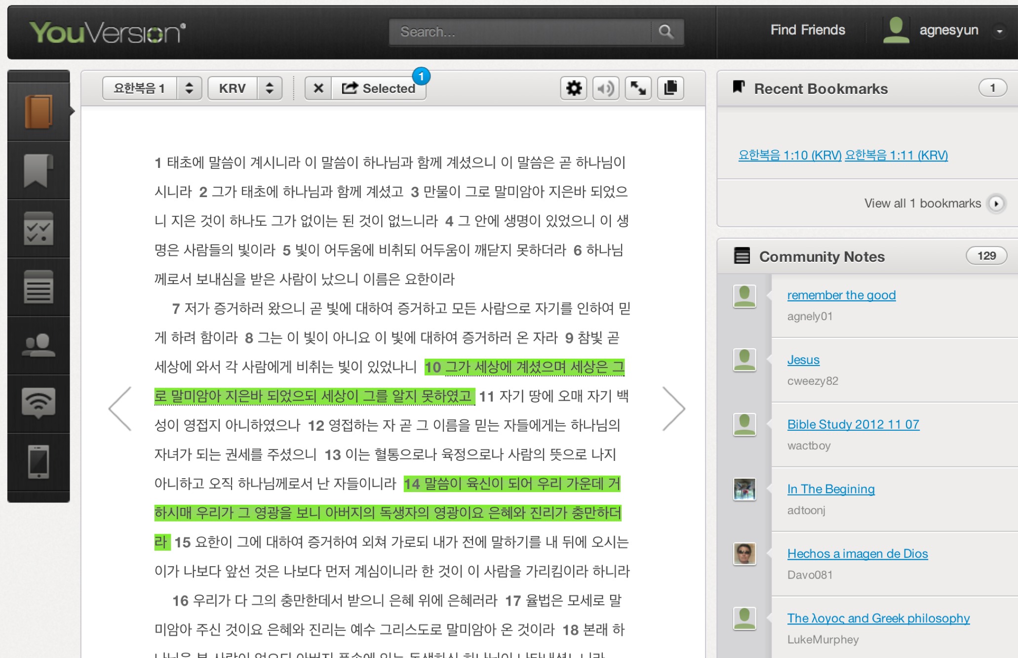 책을 읽는 것은 여행이다. 웹북과 전자책에서는 하이퍼링크를 통해 새로운 길로 접어들 수도 있다. 목적지(한 권의 책을 정독)까지 가는 방법은 직행도 있지만 읽으면서 저자에 대한 궁금증이 더 생기기도 하고, 저자가 제시한 이론이 맞는지 확인해 보고 싶기도 하고, 저자가 연결해 놓은 참고자료들을 다 둘러보면서 목적지에 다다를 수도 있다. 책의 컨텍스트가 다양해졌기 때문이며 그 경로는 독자가 결정한다. 아래는 커뮤니티와 함께 성경책을 읽는 경험을 제공하는 어플리케이션 YouVersion(http://www.youversion.com/)의 화면이다. 종이책에서 벗어나면 다양한 컨텍스트가 열린다.