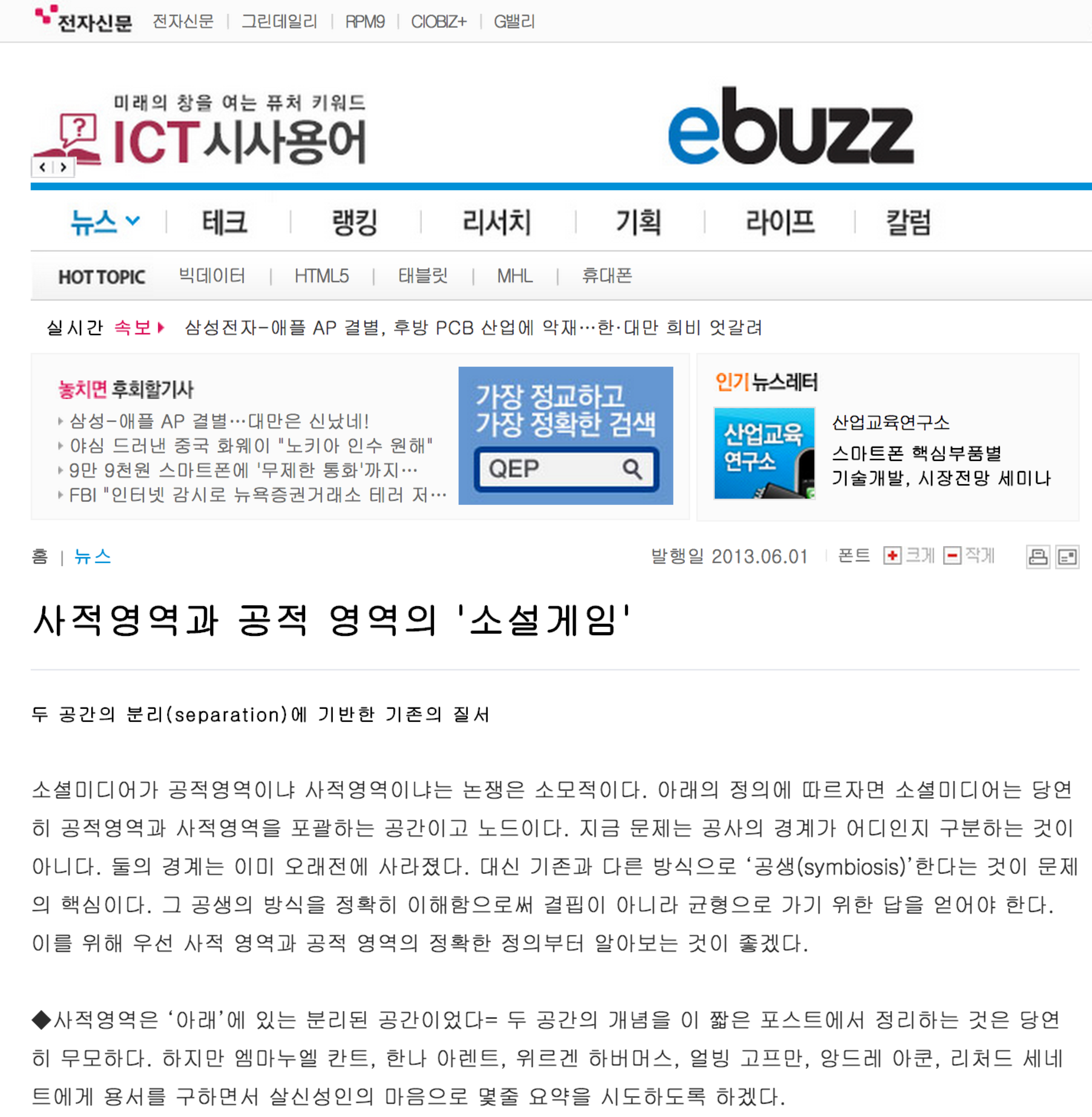 우선 사실 관계를 정리하면 다음과 같다. 오가닉 미디어랩의 포스트는 벤처스퀘어와 협의를 통해 벤처스퀘어 웹사이트에 게재가 된다. 그런데 여기에 게재된 ‘사적 영역과 공적 영역의 소셜게임‘이라는 포스트가 전자신문의 채널인 ebuzz의 기사처럼 게재되었고 이 기사가 전자신문의 기사처럼 다음 뉴스에도 배포가 된 것으로 판단된다.