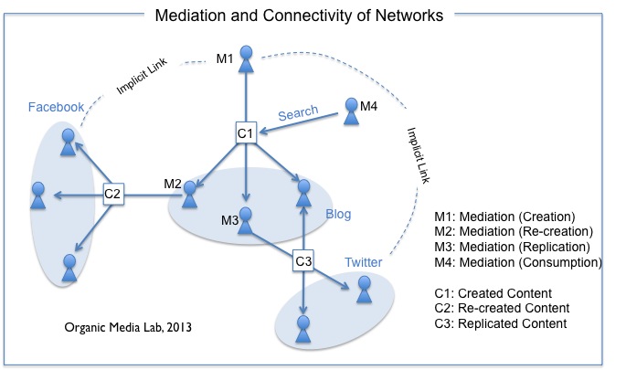 아래 스키마는 서로 다른 종류의 네트워크들이 사용자의 활동에 따라 서로 연결되고 확장되는 모습을 보여주고 있다. 사용자 M1이 만든 콘텐츠 C1은 M2의 블로그에 인용(C2)되고 이것은 다시 페이스북 사용자들에게 공유되거나 사용자 M3를 통해 트위터로 보내질 수 있다. 사용자의 동선(활동)은 블로그, 페이스북, 트위터 등 다른 종류의 네트워크를 쉽게 접목시킨다. 그 결과 아래와 같이 연결된(매개된) 네트워크가 만들어진다. (*매개(Mediation)는 ‘매개의 4가지 유형: 창조, 재창조, 복제, 소비‘에서 정리한 바 있으므로 여기서는 설명을 생략한다.)