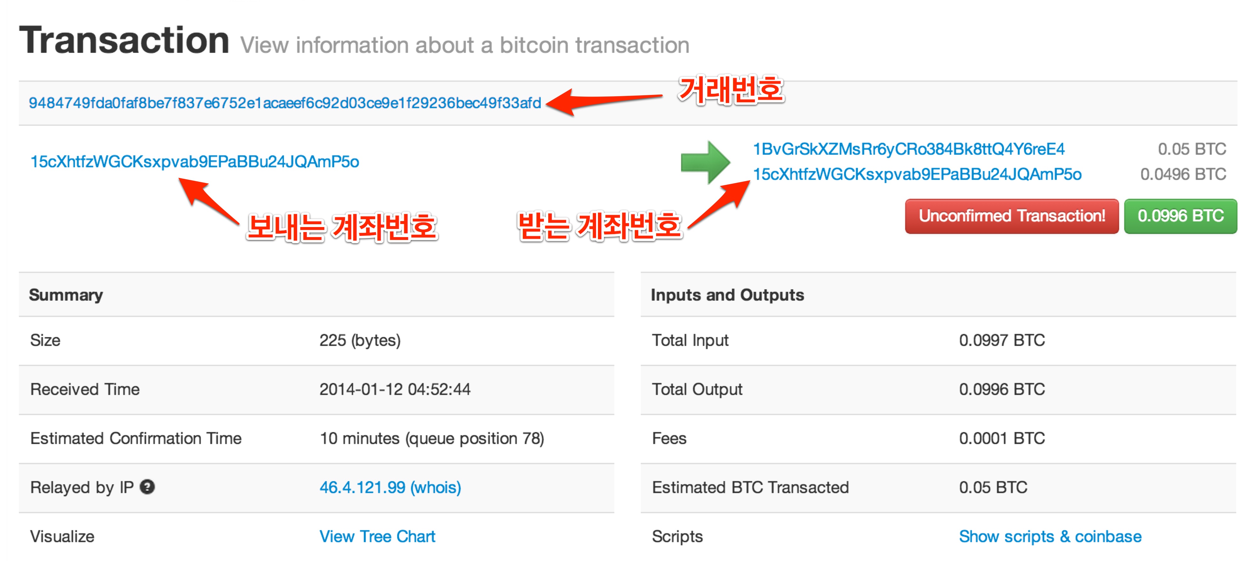 비트코인을 보내는 것은 겉보기에는 마치 이메일을 보내는 것과 유사하다. 비트코인 지갑에서 보내는 주소를 선택하고 받는 주소와 금액을 입력하면된다. 아래의 그림은 필자의 Multibit지갑의 주소에서 My Wallet 지갑의 주소로 0.05 비트코인(BTC)을 송금한 거래이다. 아직은 블록에 포함되지 않은 거래이므로 ‘미확인 거래(Unconfirmed Transaction)’으로 표시되어 있다(블록과 블록체인에 대한 설명은 ‘비트코인 채굴과 선순환 구조‘를 참고). 하지만 시간이 지나면서 확인 회수가 증가하게 되고(6번 이상 확인되면 거래가 100% 인증되었다고 생각하면 된다) 나중에는 확인 회수도 표시되지 않는다.