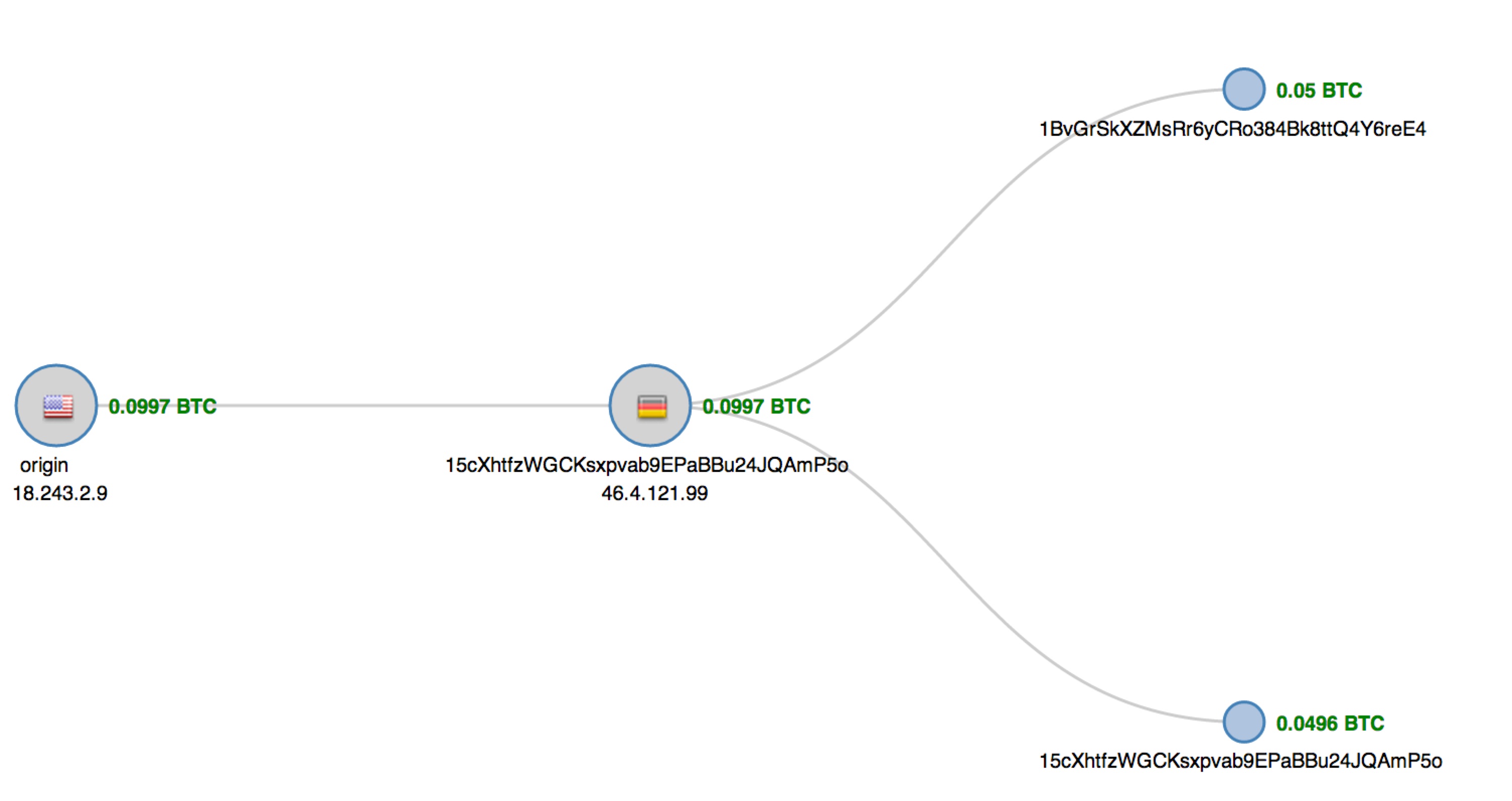 재미있는 것은 분명히 하나의 주소에서 다른 하나의 주소로 송금했는데 받는 주소는 2개라는 것이다. 이는 비트코인 거래에서는 보내는 주소의 잔액이 송금한 금액보다 큰 경우, 거스름돈을 돌려주는 방식을 취하기 때문이다(받는 주소중 하나는 보내는 주소와 같다). 이런 방식을 취함으로써 코인을 얼마든지 잘게 쪼개는 것이 가능하고(현재는 10^-8 BTC까지 쪼개진다), 거래의 흐름을 쉽게 파악할 수 있다. 아래 그림은 위의 거래를 시각화한 것으로 비트코인의 흐름을 보여준다.