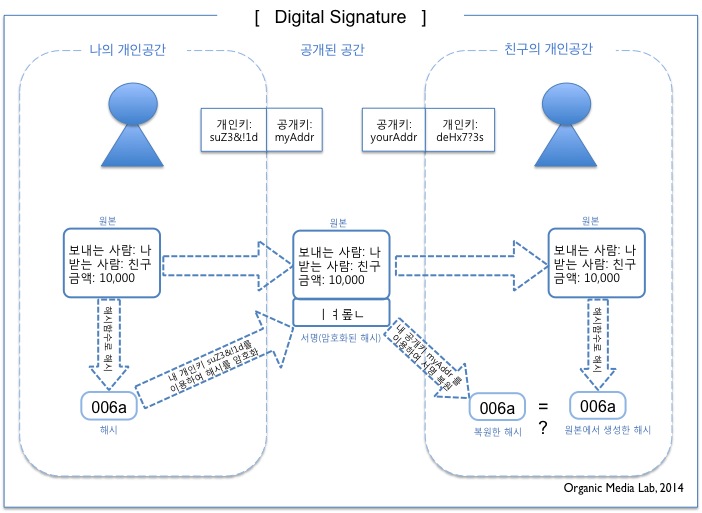 비트코인은 디지털 서명(digital signature)에 기반한 화폐이다[Sathoshi Nakamoto, “Bitcoin: A Peer-to-Peer Electronic Cash System,” 2008]. 따라서 비트코인 개념과 이의 거래를 제대로 이해하려면 디지털 서명에 대한 이해가 필수적이다. 디지털 서명은 공개키 암호화(public key encryption)와 해시(hash)를 이용하므로 이  두 개념에 대해 우선 알아보도록 하자.