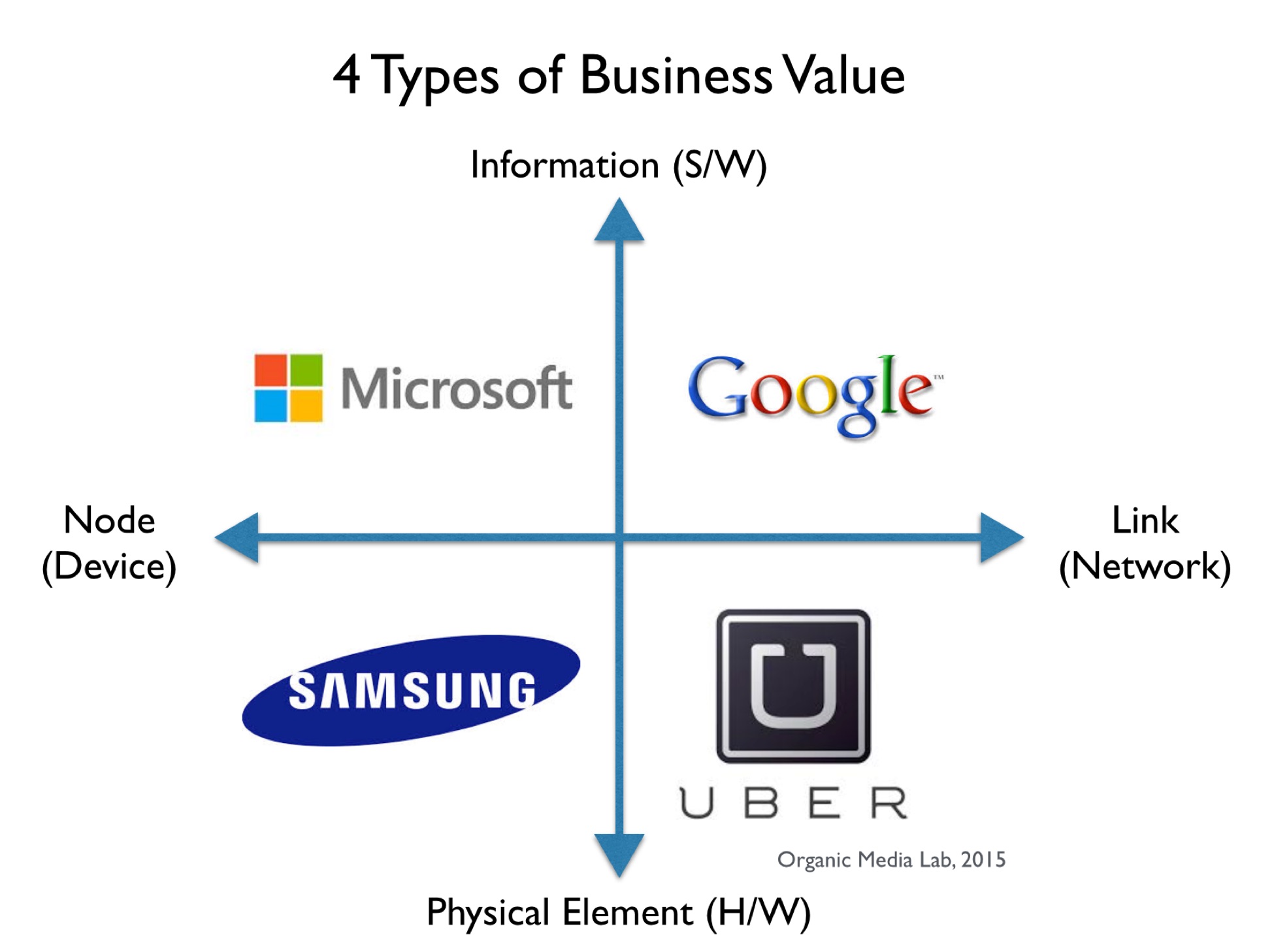 비즈니스의 가치를 물질-정보의 축과 노드-링크의 축으로 크게 4가지 유형으로 나눠볼 수 있다.