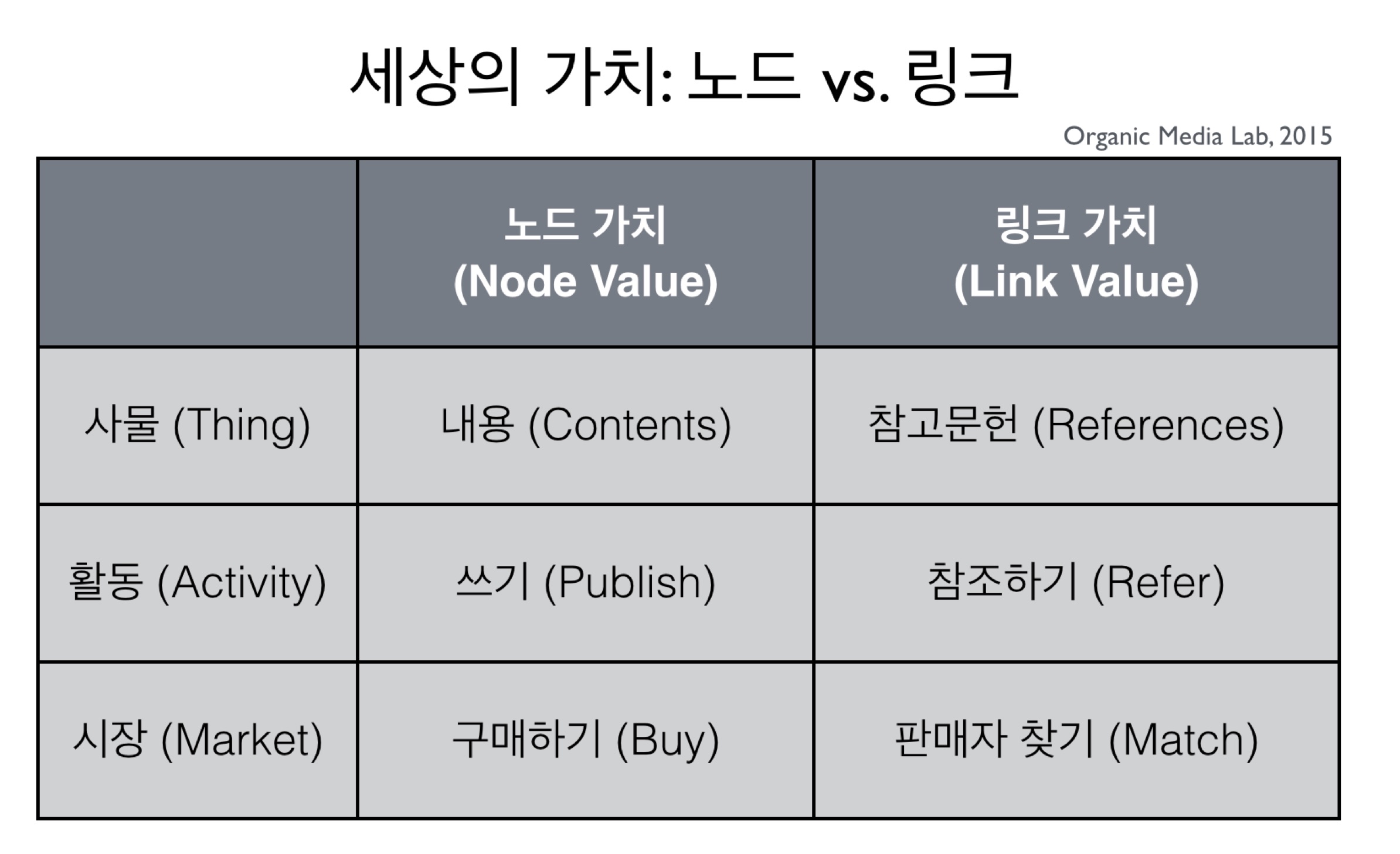가치의 중심이 노드(Node/Thing/Device)에서 링크(Link/Connection/Network)로 이동하고 있기 때문이다. 이것이 두번째 변화다. 오가닉 미디어에서 “미디어는 네트워크”이고 “오직 연결의 가치만 남는다”는 주장과 일맥상통한다. 이러한 세상을 우리는 “연결이 지배하는 세상”이라고 부른다. 하지만 가치의 중심이 노드에서 링크로 이동하였다는 주장은 쉽게 받아들이기 어렵다. 이해한다 하더라도 머리로만 이해하고 가슴으로는 이해되지 않는 경우가 대부분일 것이다. 예를 들어 아무리 웹이라도 중요한 것은 컨텐츠(노드)지, 하이퍼링크(링크)가 그렇게까지 중요한 것은 아니라고 생각한다. 그런데 현재의 웹에서 모든 하이퍼링크가 사라졌다고 가정해보자. 더 이상 웹은 정보의 보고가 아니라 정보의 쓰레기 더미일 것이다. 구글은 자신의 검색 알고리즘(페이지랭크)에 하이퍼링크의 가치를 최대한 이용(exploit)하여 현재의 구글이 되었다.
