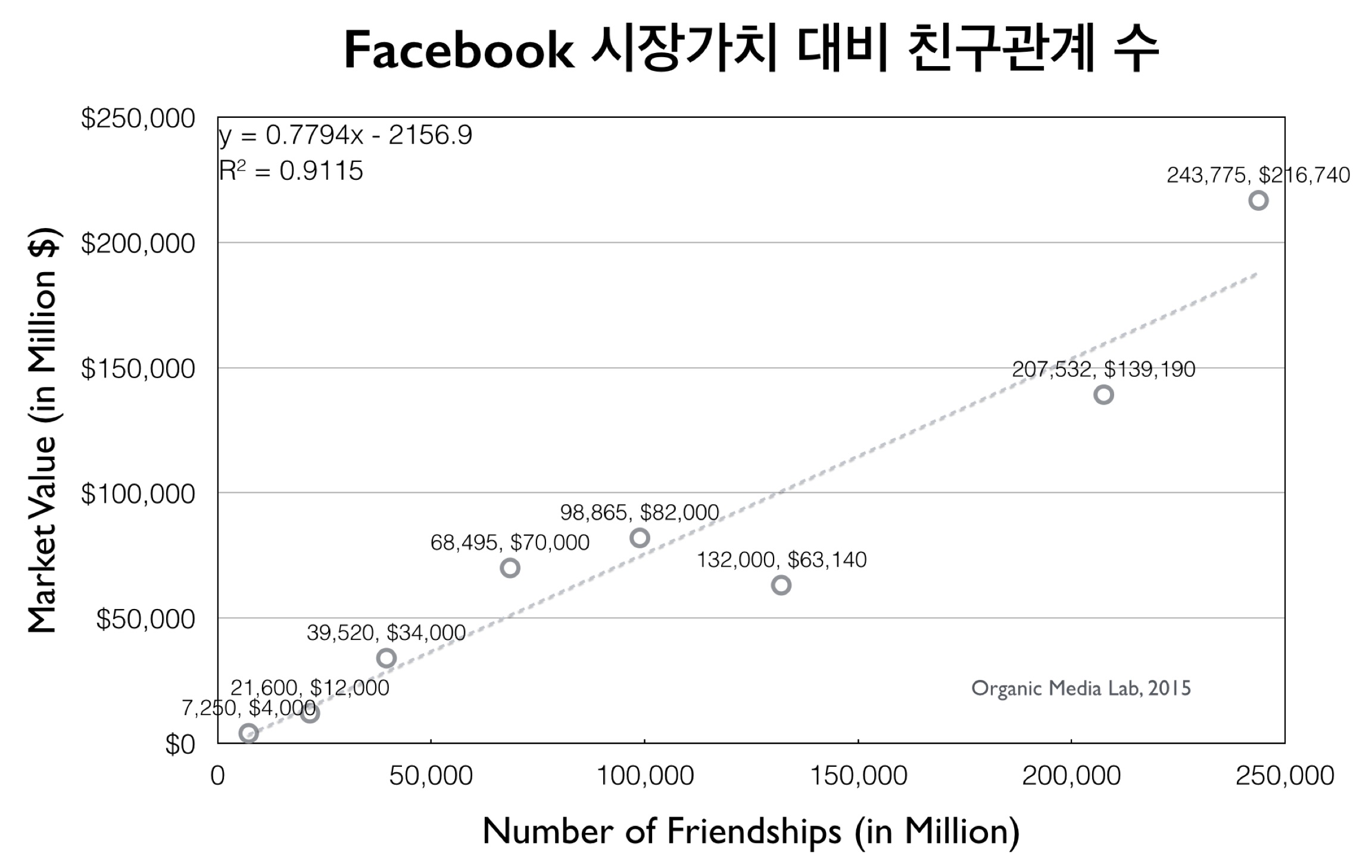 그렇다면 실제로 페이스북의 가치가 사용자(노드) 수 그리고 친구관계(링크) 수와 어떤 관계가 있는지 살펴보자. 이 분석은 시장가치(Market Capitalization)가 네트워크의 가치를 잘 나타낸다는 가정하에 진행되었다. (아래의 분석은 페이스북 등에서 공개한 데이터를 이용하였으며, 학술적으로 엄격한(rigorous) 분석이라기 보다는 독자 여러분들의 이해를 돕기 위한 것임을 밝혀둔다).