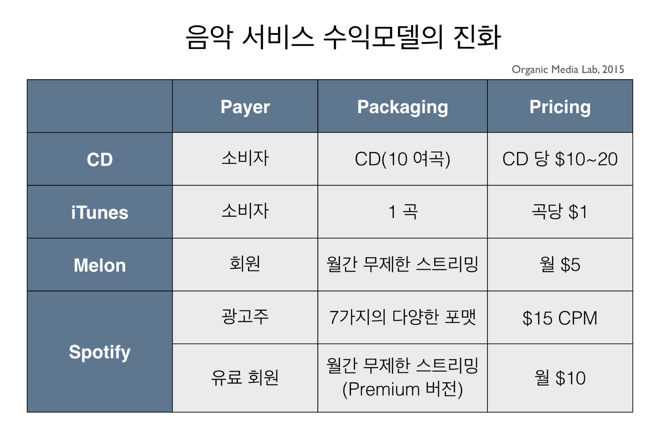 그러면 이해들 돕기 위해 음악 서비스 사례를 통해 수익 모델이 어떻게 변해왔는지 살펴보자.
