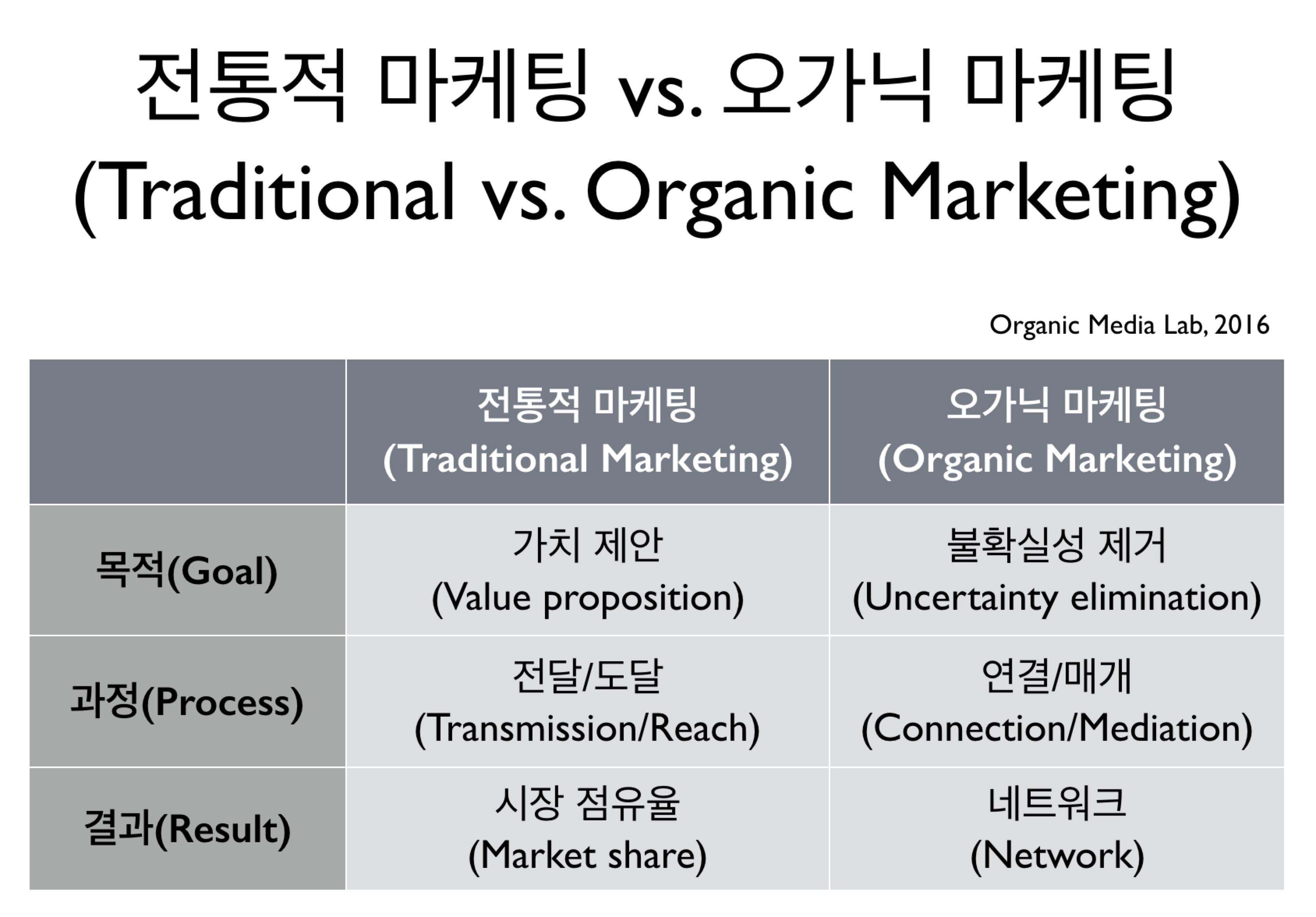 이 글은 같은 맥락에서 마케팅 개념을 정리한 것이다. 오가닉 미디어가 소셜 미디어를 지칭하는 것이 아니듯, 오가닉 마케팅은 마케팅 기법의 일부가 아니다. 마케팅의 본질적 진화다. 전통적 의미의 미디어, 제품, 소비자, 유통, 영업 등의 개념이 통째로 바뀌고 유기적 네트워크로 연결되고 진화하는 가운데 마케팅의 진화가 있다. 연결이 지배하는 세상에서의 마케팅을 어떻게 재정의할 것인지 네트워크 관점에서 살펴보고, 이에 따라 마케팅 활동의 목적, 과정, 결과가 어떻게 달라지는지 지금부터 알아보도록 하겠다.
