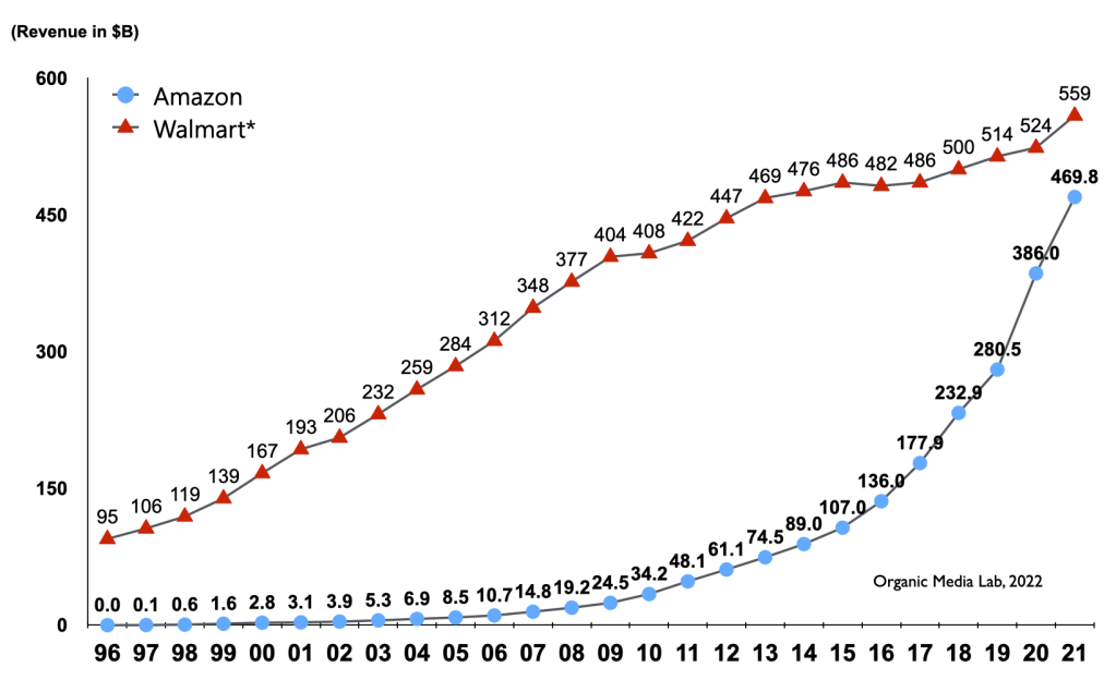 첫번째 저주는, 경쟁 상대를 터무니 없이 과소평가하게 만든다는 것이다. 기하급수적 성장을 하는 대표 기업은 아마존이다. 2000년 매출액 기준 월마트는 1,650억 달러, 아마존은 27억 달러이었다. 그런데 아마존은 지난 20년간 연평균 28% 성장했다. 20년전 1/60도 안되던 기업이, 10년전에는 1/16, 현재는 월마트의 턱 밑까지 좇아왔다. 월마트와 같은 기업은 어떤 우를 범하게 되는 것일까?