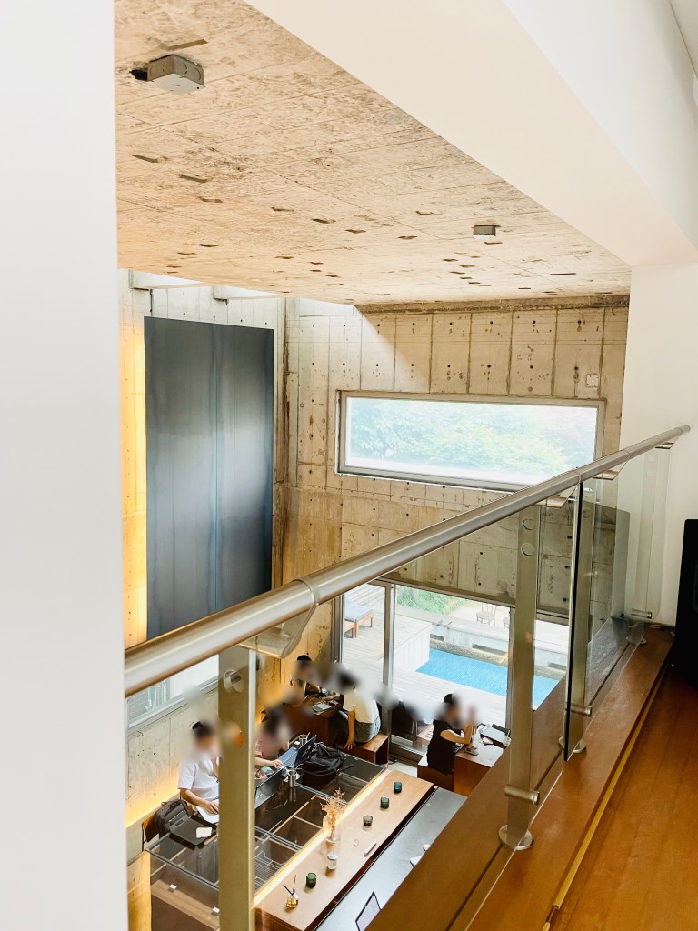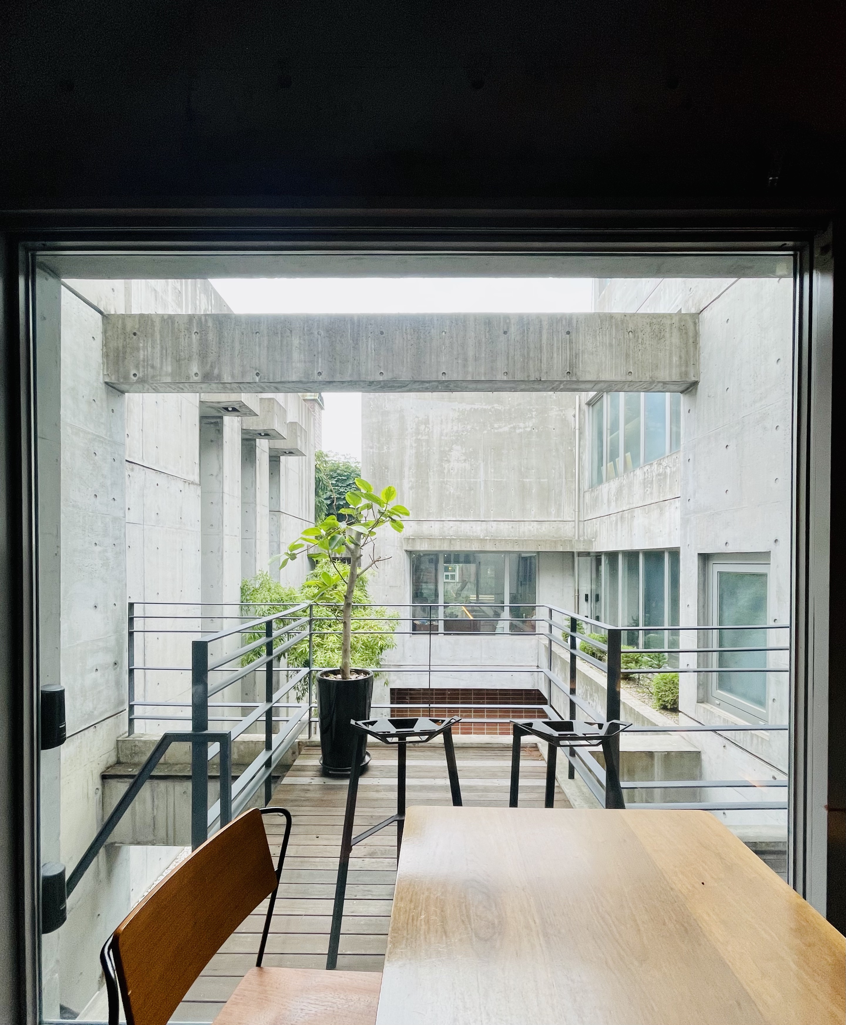 이 공간은 개인주택을 카페로 개조했다고 하는데, 전체 콘크리트 마감과 높은 천장, 공간의 어디에 서든지 채광을 보장하는 중정과 유리창들이 무척이나 인상적이었다. 댄스위드스페이스 워크숍답게 우리와 함께 참여중인 건축사는 공간에 도착하면 습관처럼 늘 구석구석 공간을 살피는 일부터 시작한다. 콘크리트 골조뿐만 아니라 모든 인테리어 요소들을 설계 단계부터 꼼꼼히 고려한 건물축물이라며 몇가지 인상적인 곳을 알려주는 것도 잊지 않았다.