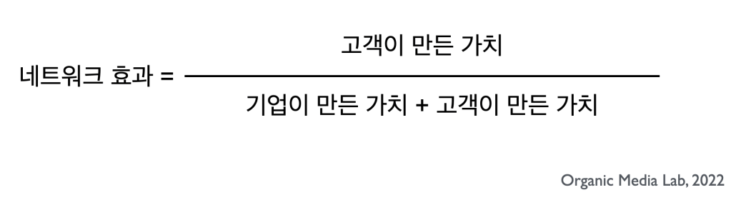 네트워크 효과는 가치 관점에서 선순환을 이룬다. 네트워크 효과는 일반적으로 같은 제품을 소비하는 사용자 수가 늘어나면 늘어날수록 그 제품을 소비함으로써 얻게 되는 효용이 더욱 증가하는 현상을 일컫는다. 예를 들어, 페이스북의 사용자가 많으면 많을수록 이들이 친구관계를 더 많이 맺으면 맺을수록 페이스북의 가치는 더욱 높아지는 것이다. 오가닉 비즈니스의 관점(고객이 직원이다)에서 네트워크 효과를 설명하자면 더 많은 고객이 직원이 될수록 고객이 만드는 가치가 차지하는 비중이 커지는 현상을 의미한다. 따라서 네트워크 효과는 다음과 같이 측정할 수 있다.
