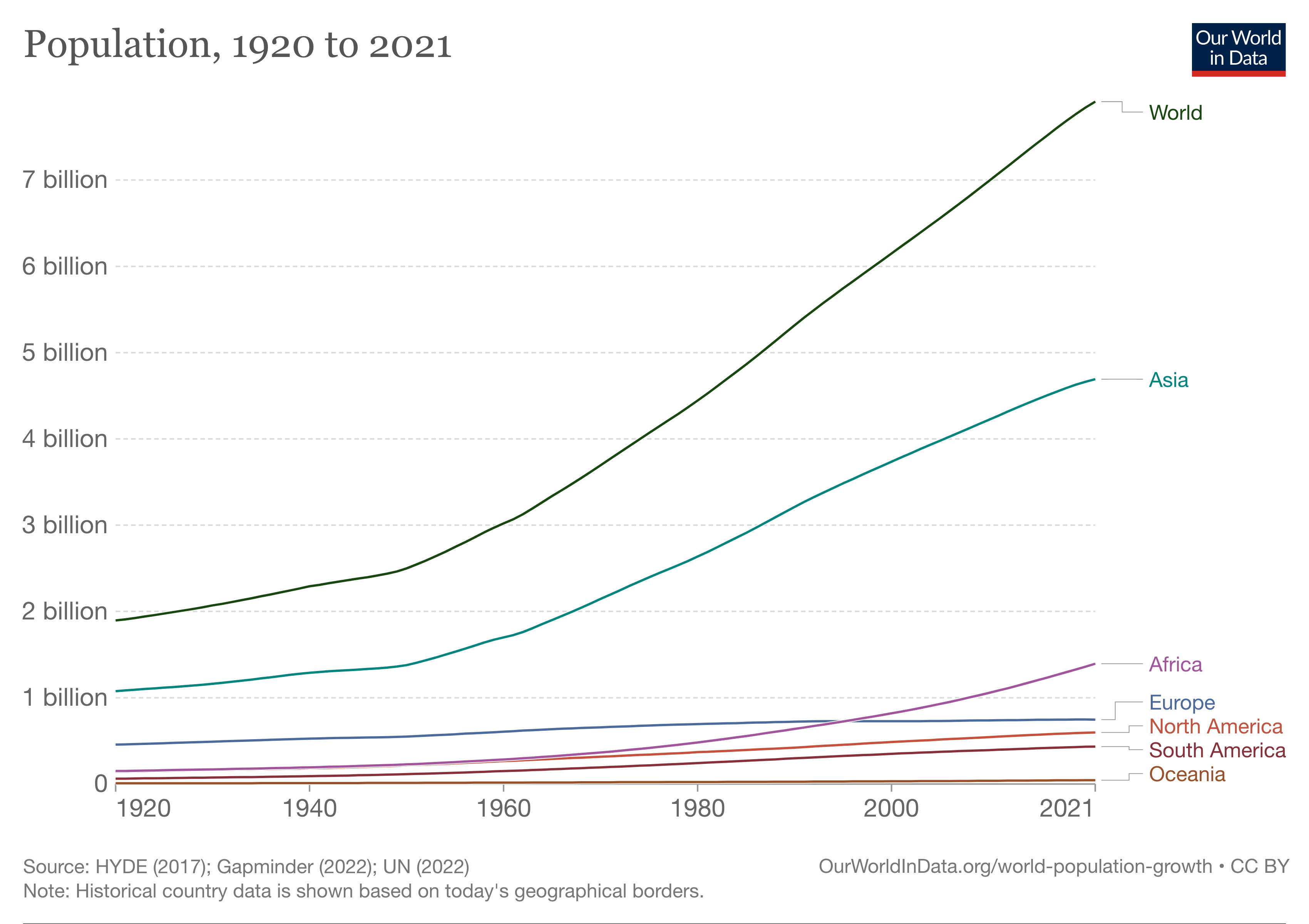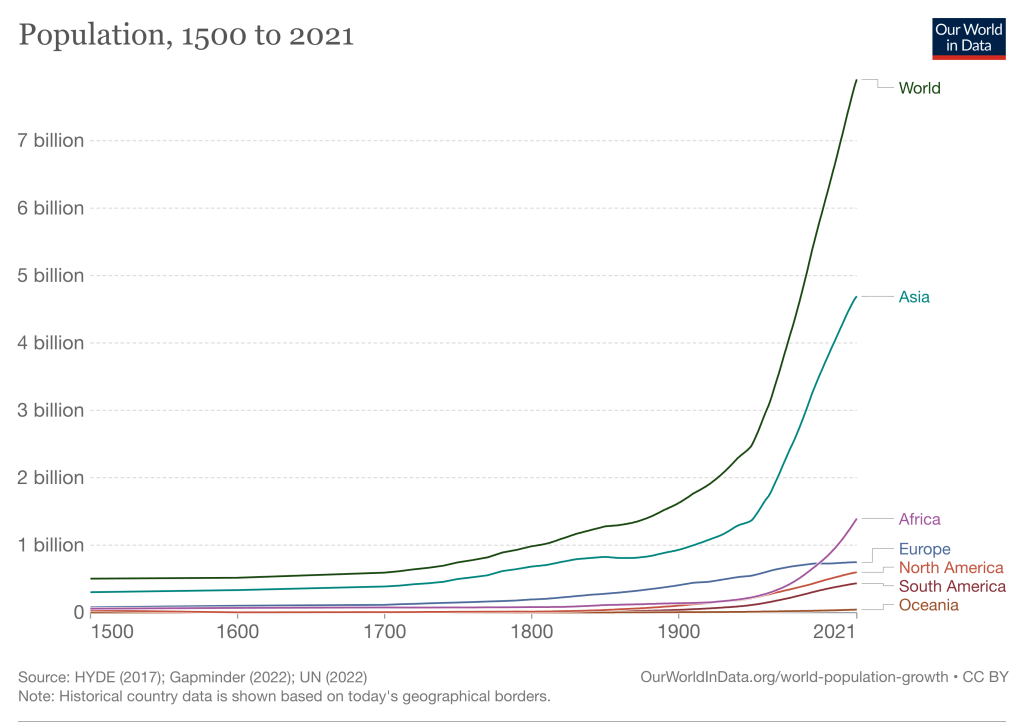 아래 그래프는 최근 500년간 인구가 어떻게 증가해왔는지 보여주고 있다. 500년 전의 인구수는 5억명 수준으로 2021년 기준 인구수 80억명의 1/20이다. 지구를 해치는 인구의 숫자가 이렇게 많이 늘어났다는 것이 아니다. 우리가 당면한 문제가 선형적이지 않고 ‘기하급수적’인 속성을 가지고 있다는 것이다.