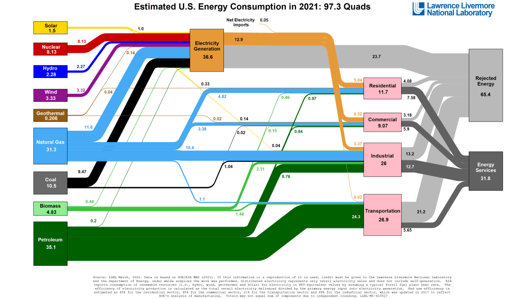 아래의 에너지 플로우 차트는 각종 에너지원과 에너지 소비의 흐름을 보여주고 있다. 예를 들어 현재는 생산된 에너지의 32% 정도만 실제로 활용되고 나머지 68%는 열 등으로 낭비된다. 특히 휘발유가 중심인 교통수단은 79%의 에너지가 낭비되고 있음을 알 수 있다.