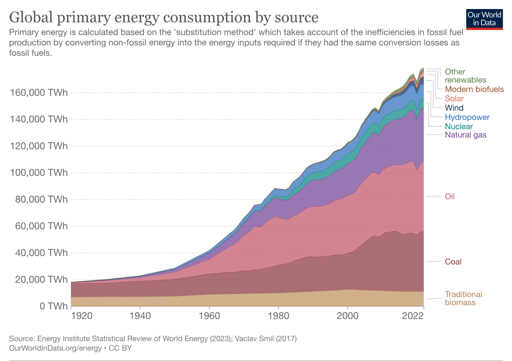 에너지 사용량의 증가 속도는 더 빠르다. 지난 100년 간 인구 수는 4배, 이에 비해 에너지 사용량은 10배 가까이 늘었다. 역시 강조하고자 하는 것은 몇 배가 늘어났다는 것이 아니다. 인구 수와 에너지 사용량이 ‘기하급수적’ 증가를 보이고 있다는 것이다. 지난 500년간의 인구 수는 기하급수적(지수함수적)으로 증가하고 있는 한편 여기에 제 3세계의 경제성장은 1인당 에너지 사용량을 크게 높이고 있다. 결과적으로 에너지 사용량은 인구 수 보다 더 빠른 증가를 보이게 된다.