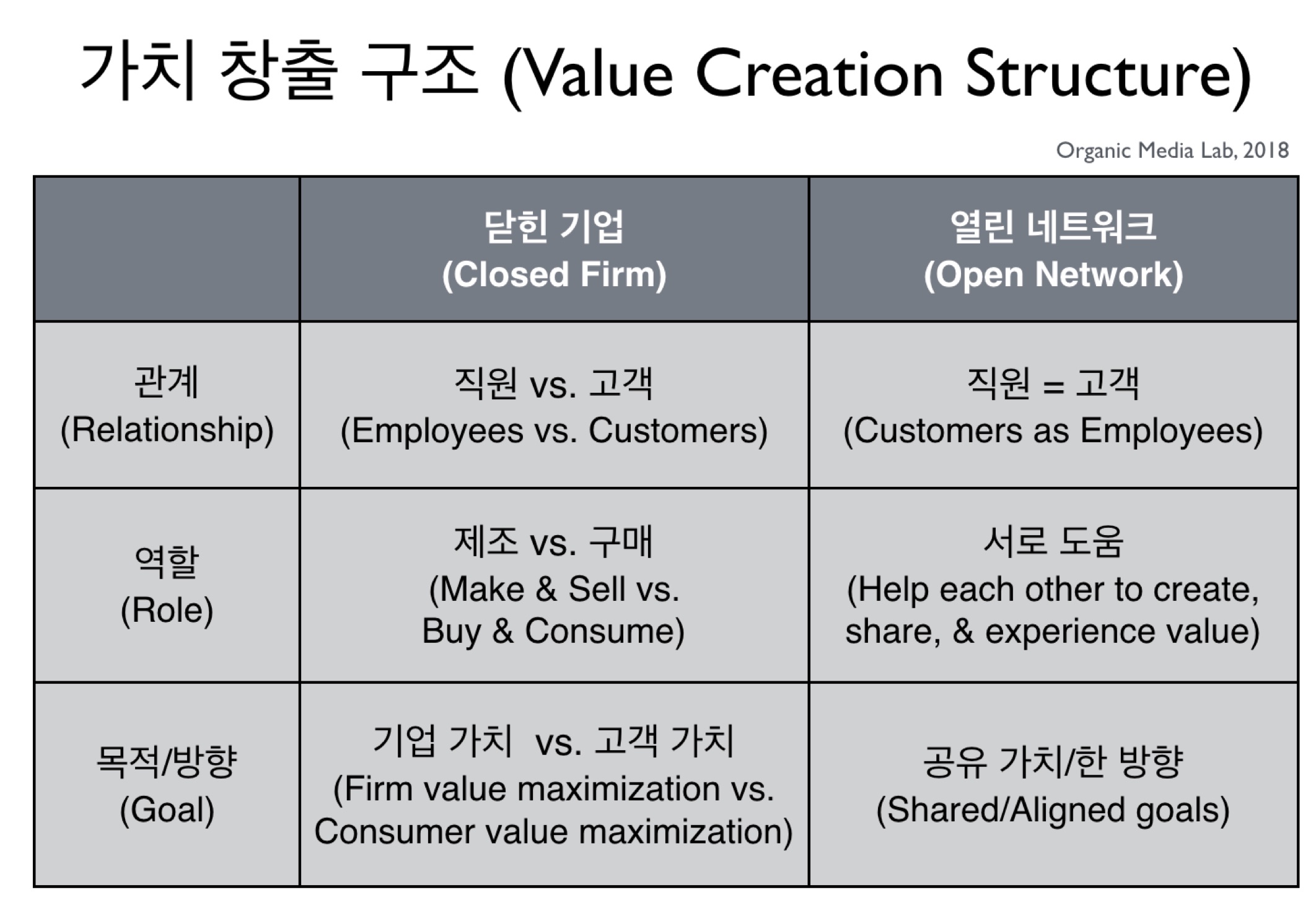 오가닉 비즈니스 관점에서 보면 고객은 비즈니스의 가치(네트워크)를 만들고 이를 성장시키는데 주도적인 역할을 하는 직원이다. 따라서 기업에 고용된 직원과 고객간의 경계를 허물고 조직을 네트워크 관점에서 재정의해야 한다. 하지만 대부분의 기업은 여전히 자신이 가치를 만드는 주체이고 고객들은 이를 구매하고 이용하는 대상으로 생각한다. 이러한 사고에서는 기업의 목적(기업 가치의 극대화)과 고객의 목적은 항상 대치될 수 밖에 없고 직원과 고객간에는 명백한 경계가 존재한다.
