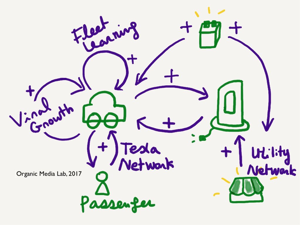 오가닉 비즈니스 관점에서 보면 테슬라는 자동차(콘텐츠/기기)를 만드는 기업이 아니라 고객과 함께 자동차의 네트워크를 만드는 기업이다. 하지만 자동차의 네트워크에서 머물지 않고, 수퍼차저(충전소)의 네트워크이기도 하며, 배터리의 네트워크이기도 하다. 이러한 네트워크는 콘텐츠/기기를 제품으로 생각하는 비즈니스와 여러가지 측면에서 다른 성격을 가지고 있다.