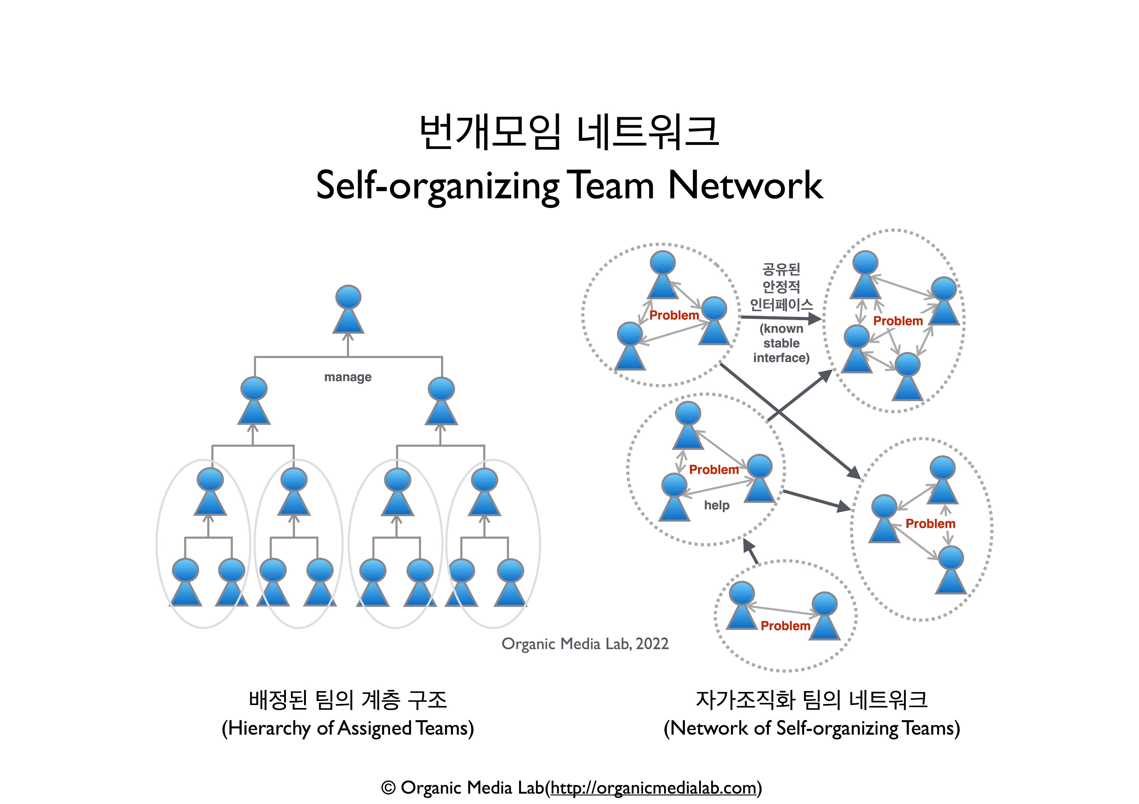 오픈 소스 프로젝트(Open Source Project)가 이러한 방식으로 이미 소프트웨어 생태계를 혁신시킨 것을 기억해보기 바란다. 제1원칙 사고와 즉각적이고 객관적인 피드백, 신뢰를 원칙으로, 3시간 주기(problem-to-value cycle time)로 스스로 문제를 해결하는(self-managed) 조직, 이를 우리는 ‘번개모임의 네트워크(Self-organizing Team Network)’라 이름 붙였다.”