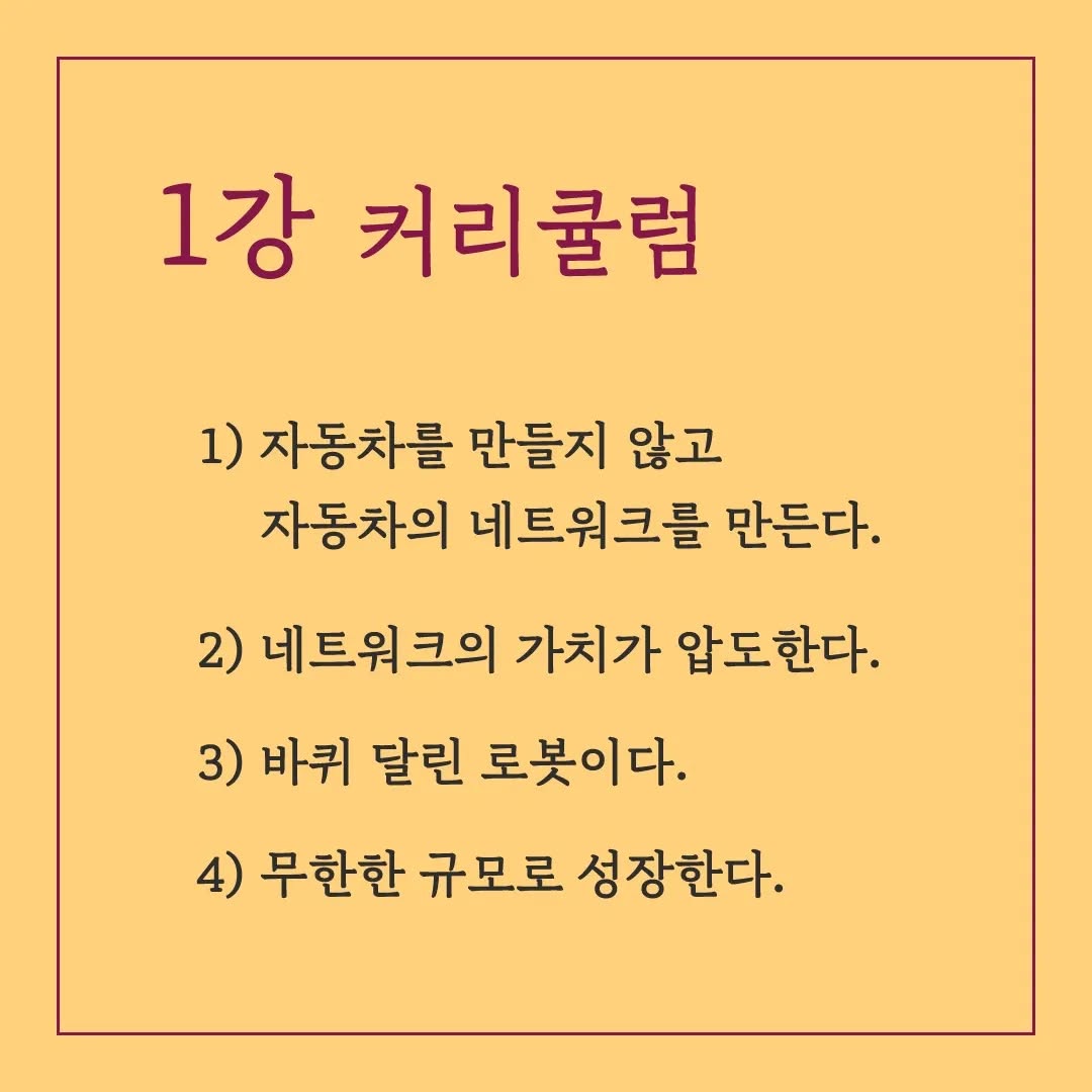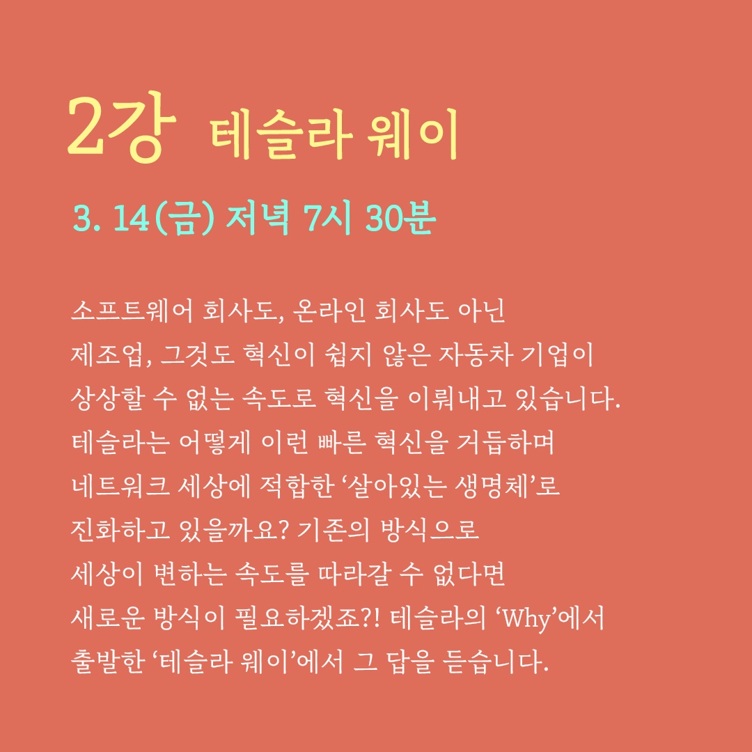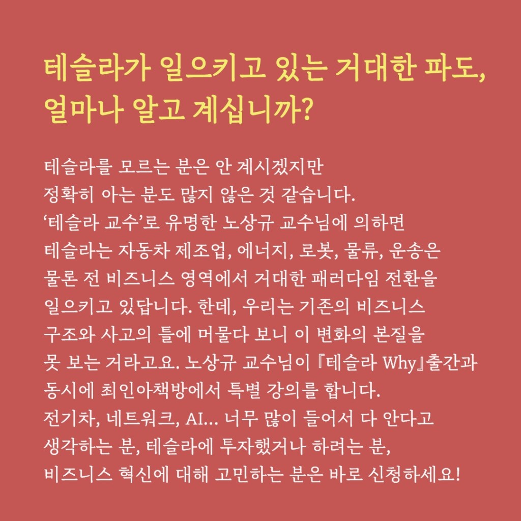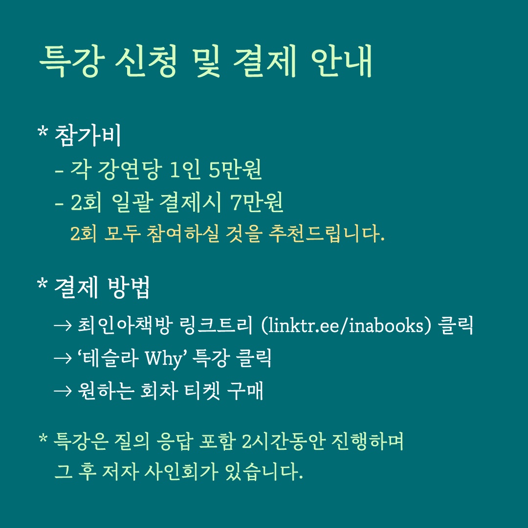 출간 기념 파티에 오시는 것이 부담되셨던 분들, 진지한 강연을 집중해서 듣고자 하시는 분들, 테슬라가 궁금하지 않은데 왜 자꾸 테슬라 얘기를 하는지 궁금하신 분들, 모든 분들께 이 강의를 권해드립니다. 대중을 위한 공개 강의는 이번이 처음이자 마지막이 될 것 같습니다.